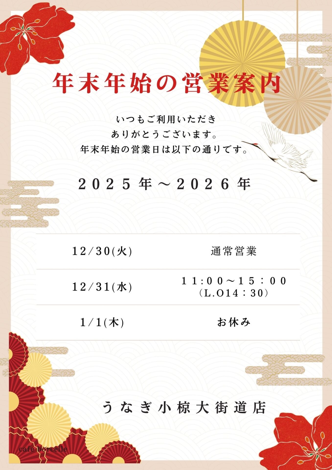 今年も残るところ、あとわずかになりました。今年もご来店頂いた皆様本当にありがとうございました。どうぞ、来年も「うなぎ小椋大街道」をよろしくお願いします。スタッフ一同、心よりお待ちしております。